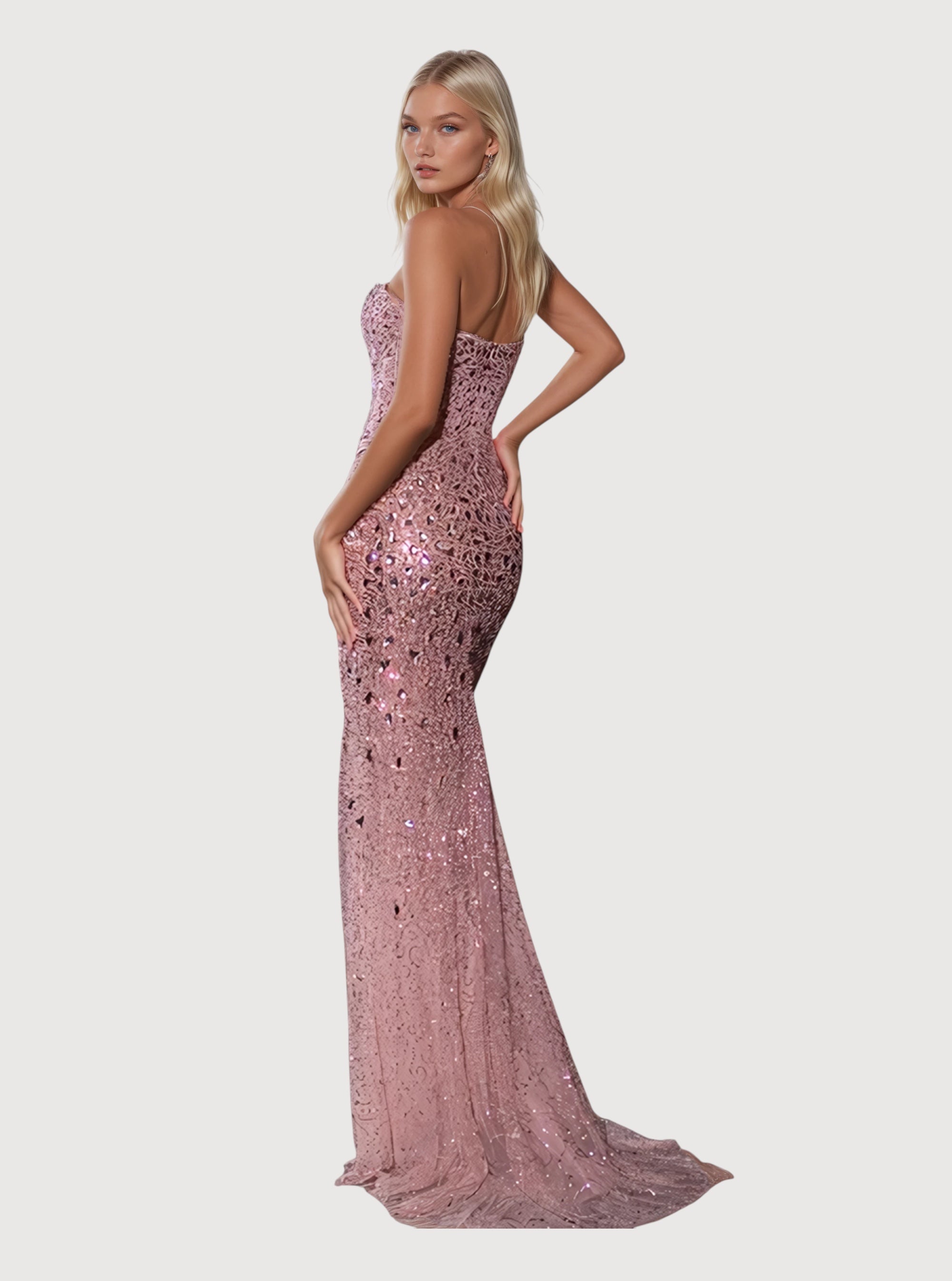 Designed with expert craftsmanship, the Athens gown features a couture, fitted silhouette accentuated by heavy embellishments of sparkling rhinestones. Its blush-pink hue adds a unique, elegant touch, while the sweetheart neckline enhances the bust gracefully. The gown includes a zip fastening and built-in corsetry to sculpt and snatch the waist, ensuring a flattering fit for a striking, refined appearance. Perfect for making a memorable impression at any formal event.