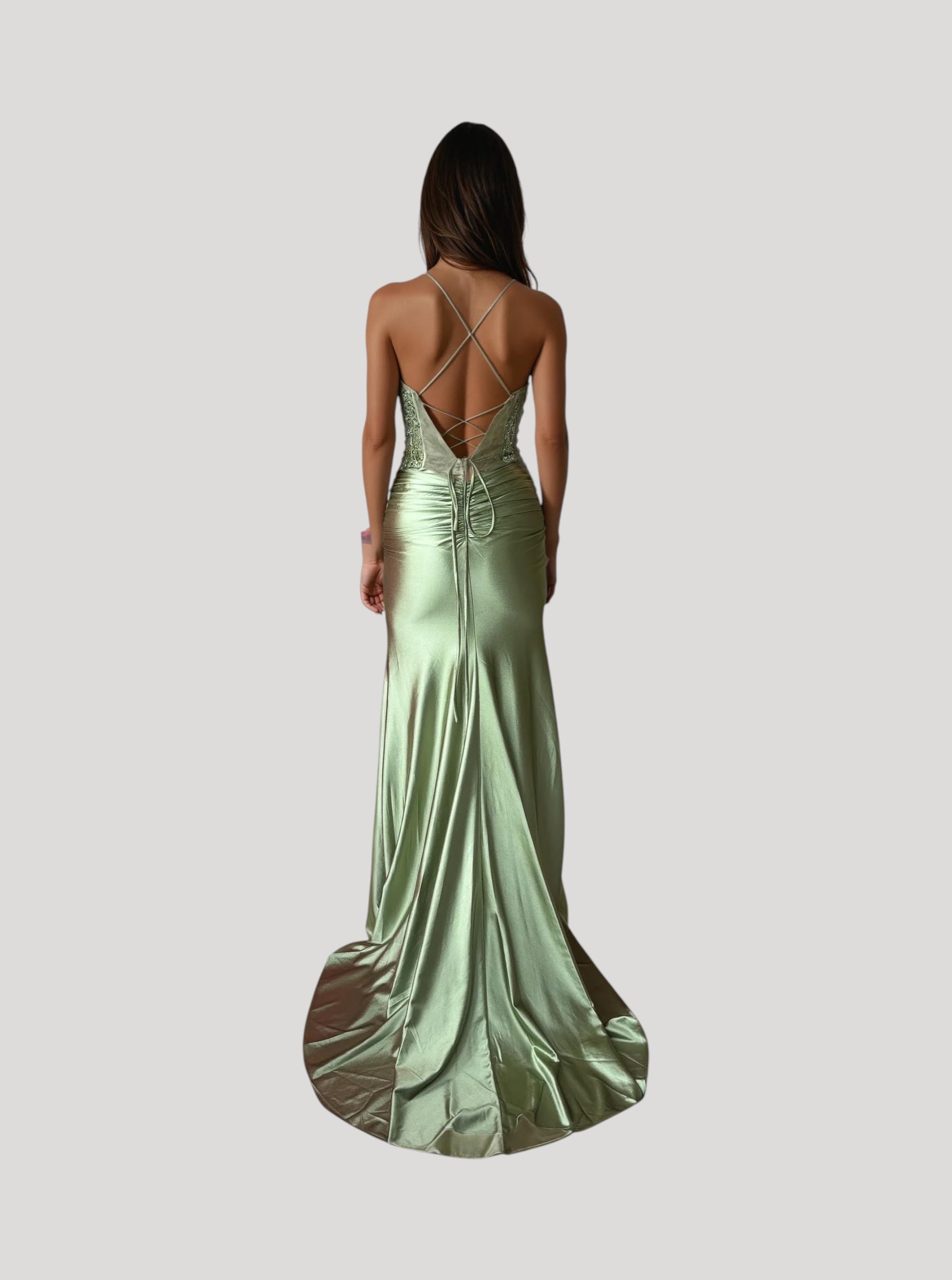 The Storm dress presents a fitted satin silhouette accentuated by a lace bodice adorned with delicate beading. It features exposed corsetry on the front and back with a corset-style closure, combining structure with elegance. Available in light blue, sage green, and navy, the dress also includes a tasteful slit for added movement and sophistication.